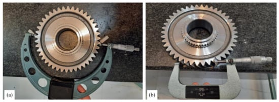 The output measurable parameters of the gear, including values for span size and over-two-balls measurement, are listed in Table 5. The values were validated using special gear software. The measurements over two balls and span size using appropriate balls, a caliper, and a disc micrometer are demonstrated in Figure 9. To determine the form of involute, three values for with different balls were obtained. The smallest one fell below the pitch diameter of the gear, the medium one was closer to the pitch diameter, and the bigger pin diameter was used to encompass the involute area of the gear over the pitch diameter. Moreover, a span measurement was used to decrease the potential error of calculations and increase the precision of obtained results.