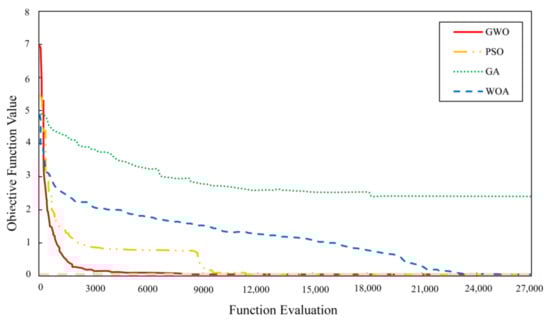 The algorithms’ convergent curves reaching the minimum defined objective function for GWO, WOA, PSO, and GA.