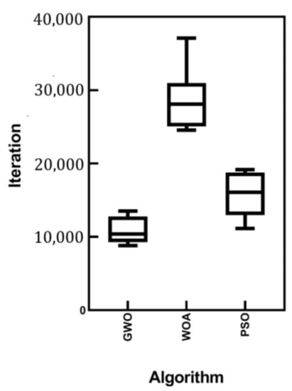 To consider the average number of iterations in which the best results for each proposed algorithm are reached, boxplots for GWO, WOA, and PSO were generated and are shown in Figure 11. An illustrative comparison via the given boxplots demonstrates the superiority of GWO over the other two algorithms. Because of the poor performance of GA in finding optimum results, it has been omitted from the performance comparison.