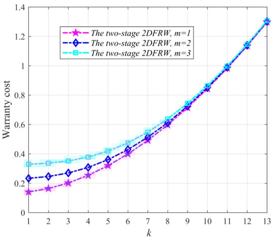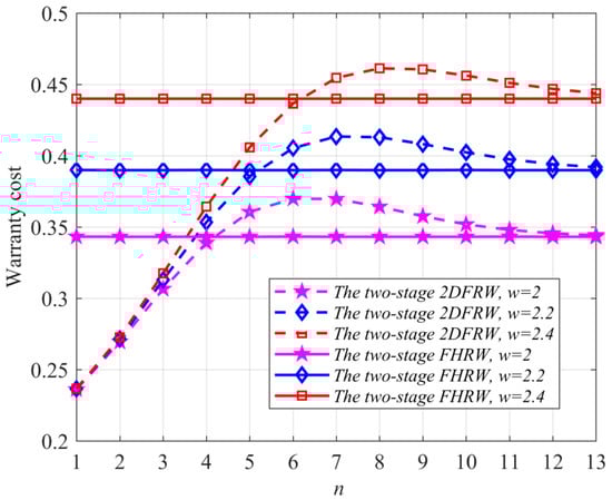By setting and , Figure 2 has been used to further explore the characteristics of the two-stage 2DFRW. Figure 2 shows that the increase in can enhance the warranty cost of the two-stage 2DFRW. The core cause of such a law is listed as follows: the increase in can extend the coverage range of the latter stage warranty, which is not affected by any of ‘whichever occurs first and last’. In Figure 2, it is found that when is smaller, the warranty cost of the two-stage 2DFRW increases with ; when is larger, the warranty cost of the two-stage 2DFRW tends to the same value with . The smaller can keep each of the two latter stage warranties, and the increase in can extend the coverage range of the warranty of the last stage. The larger keeps the latter stage warranty with ‘whichever occurs first’ and removes the latter stage warranty with ‘whichever occurs last’, which means that the warranty cost of the latter stage warranty with ‘whichever occurs first’ is a unique cost. Therefore, the above two cases occur.