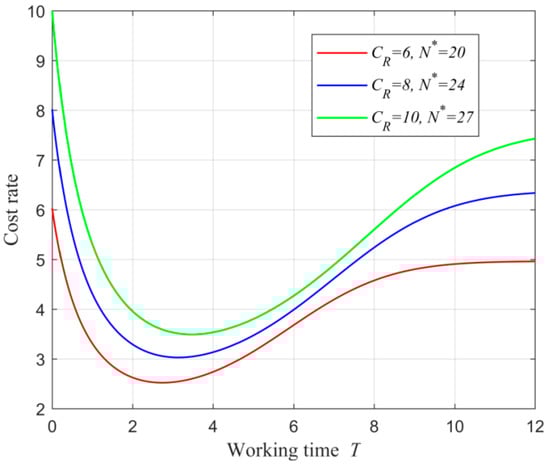 To verify the feasibility of RNN and explore how affects the optimal RNN, Figure 3 has been provided by using , and . Figure 3 shows that the minimum cost rate exists, which signals that the RNN is feasible. In addition, Figure 3 shows that the increase in increases the minimum cost rate , the optimal working time and the optimal mission cycle number .