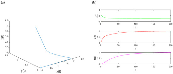 We sketch three time series data for the system (8) when and , as clearly detailed in Figure 1b. It manifests that the fast variable jumps to 2 instantaneously at first, and then decreases to 1 rapidly and suddenly. The green curve about stays at the same level after . From the time series drawings of the slow variables and , they both grow to 1 eventually. The red path about increases much quicker than the purple trajectory about .