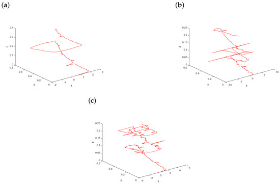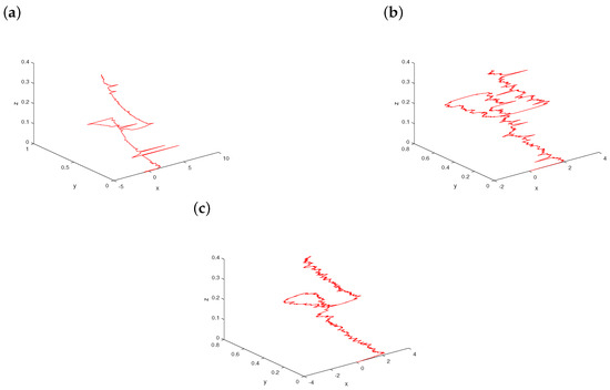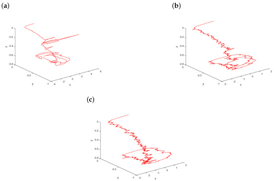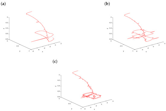Now, we fix and consider a variation of σ in system (7) starting from with a scaling parameter ; see Figure 3. For small enough , the path has a spiral pattern with small-amplitude fluctuations, which is clearly demonstrated in Figure 3a. When σ-value just arrives at 0.5, the status of the path changes happens abruptly for stochastic system (7) as plotted in Figure 3b. As the noise intensity σ increases further to 0.8, large variations in the dynamics of the trajectory are indicated in Figure 3c because of strong external noise. Based on the effects of increasing noise intensities, the curves become more and more sophisticated.