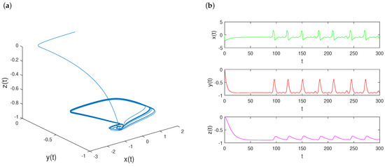 As seen in Figure 4a, there is a rich variety of dynamics which can be plotted in three-dimensional space. For one set of initial conditions , the blue trajectory of the solution of system (12) turns around exponentially, and moves closer and closer to the fold curve in finite time. The three variables , , and coexist and oscillate in phase. There are three distinct amplitudes with respect to , , and . The shapes have discrete peaks displaying the quasiperiodic behaviors. The results are summarized in Figure 4b.