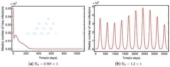 - If , then the disease-free periodic solution defined by (6) is globally attractive for system (1) in X.