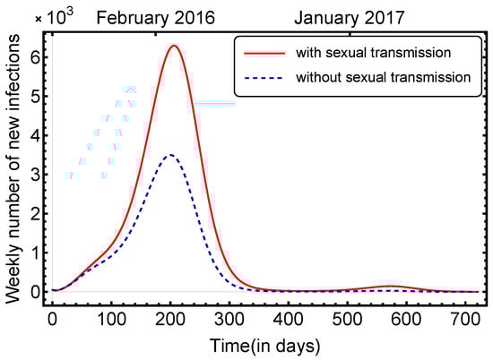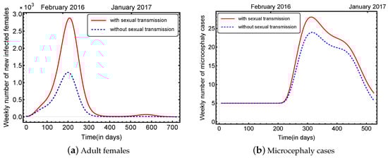 - Saad-Roy, C.; Ma, J.; Van den Driessche, P. The effect of sexual transmission on Zika virus dynamics. J. Math. Biol. 2018, 77, 1917–1941. [Google Scholar] [CrossRef] [PubMed]