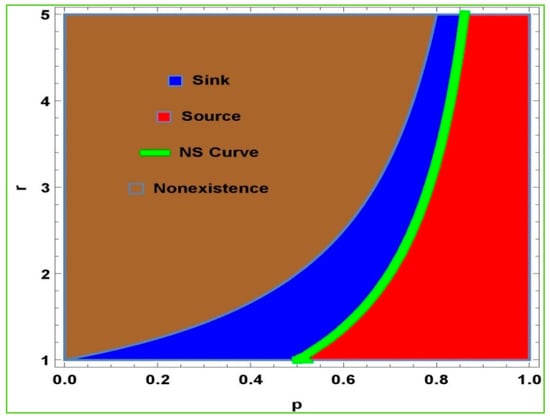Topological behavior of equilibrium point Ω where 1 < r < 5 and 0 < p < 1.