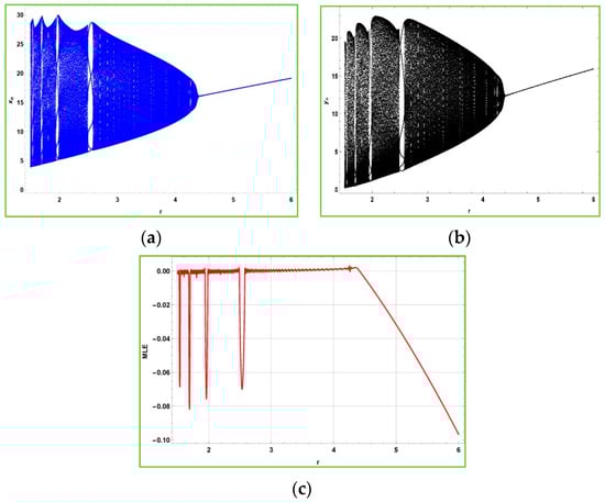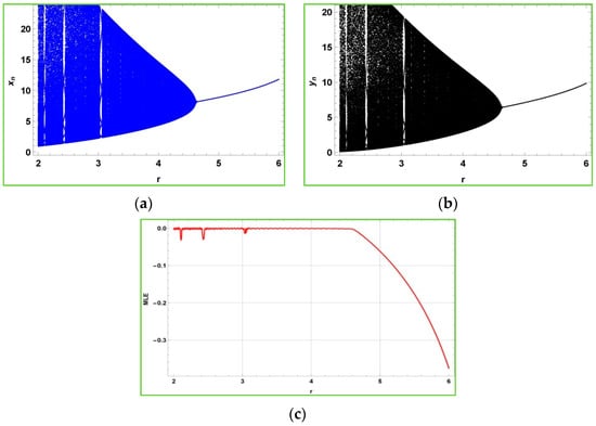 Figure 2 shows that after the bifurcation point , the populations described in the model (2) experience quasiperiodic behavior due to emergence of Neimark–Sacker bifurcation. Furthermore, is the non-chaotic region for the model (2), and is its chaotic region. From Figure 2c, it is obvious to observe that the maximum Lyapunov exponents are almost about zero due to the quasiperiodic behavior.