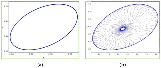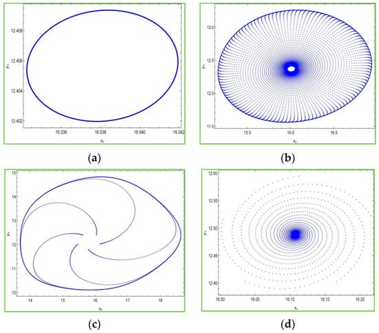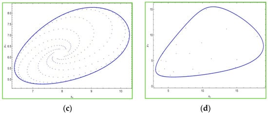 The Figure 5 shows that at and model (3) experiences the Neimark–Sacker bifurcation. Furthermore, at a unique positive equilibrium point exists. The phase portraits of model (3) for , and are depicted in Figure 6a–d as: