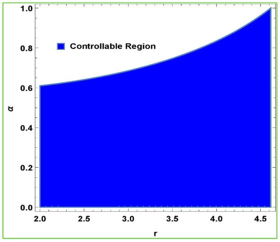 Next, we want to observe the effectiveness of the hybrid control method in the chaotic region due to the emergence of the Hopf bifurcation in the model (2). For this, we choose two fixed parameters, that is, , , and keep on varying the other two parameters in the approximate intervals. For this, it is suitable to choose the whole chaotic region for the bifurcation parameter and the whole allowable unit interval for the control parameter . The stability region (controllability region) of system (6) can be shown by Figure 4, which shows the effectiveness of hybrid chaos control methodology: