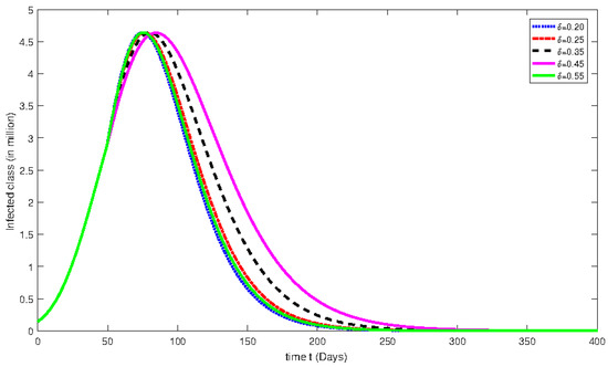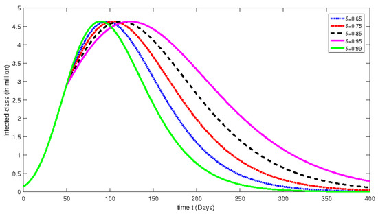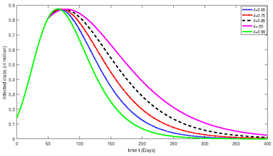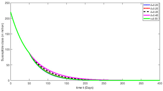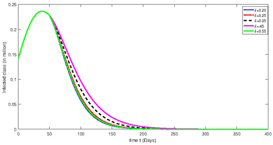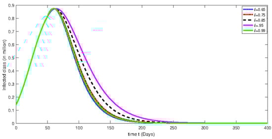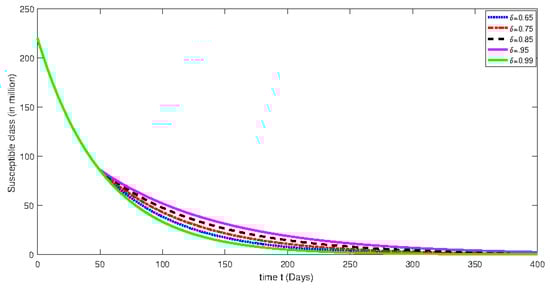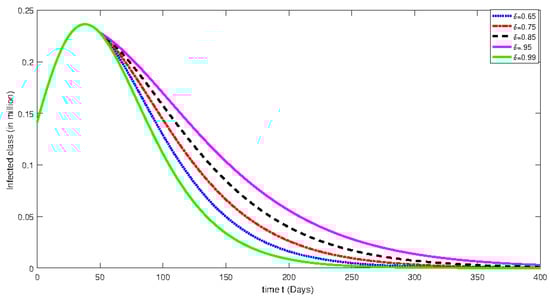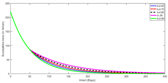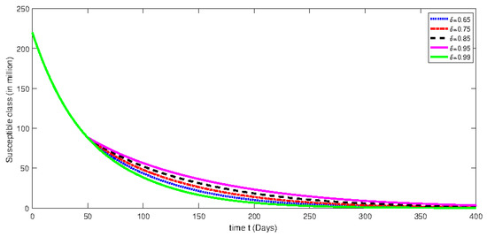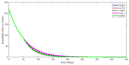 From Figure 1, Figure 2, Figure 3, Figure 4, Figure 5, Figure 6, Figure 7, Figure 8, Figure 9, Figure 10, Figure 11 and Figure 12, we see that at greater fractional order the effect of memory is more clear. Additionally, with the passage of time, the population of susceptible class is decreasing until it becomes stable and the convergent effect can be observed clearly. On the other hand, an infected class population initially increases for less than 100 days and then decreases. Moreover, the dynamical behavior effect has also been investigated by using various rate of isolation. The greater the isolation value, the smaller the spreading of the infection process will be. On the other hand, we see that the effect of memory is decreasing when the fractional order values are decreasing. The dynamical behaviors of both classes are the same as mentioned earlier. Further, the change in dynamical behavior near the point t = 100 can be observed clearly. After the mentioned point, the dynamics assume the multi-behaviors. This multi-behavior can only be clearly and brilliantly detected by using the piecewise derivative concept.