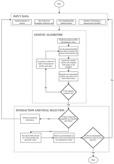 A genetic algorithm is used to infer representative profiles and parameter values compatible with the decision examples provided. The canonic version of a genetic algorithm was used to define the most convenient parameter values. The description of this genetic algorithm is provided in Section 4.3.