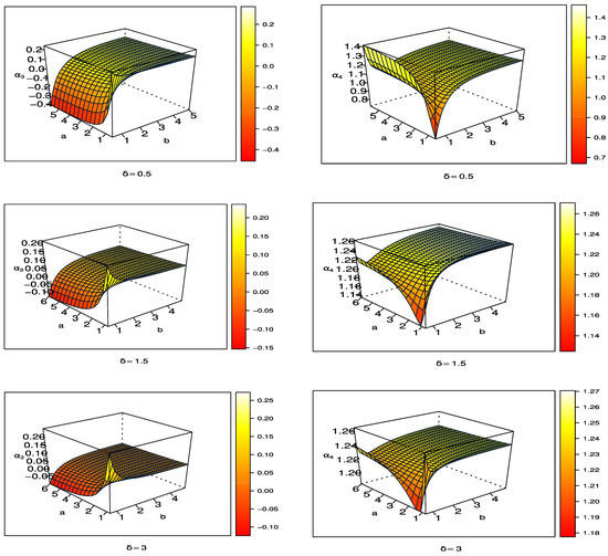 Table 1 displays that the UPBXD is right- and left- skewed in accordance with the values of Additionally, the distribution is leptokurtic and platykurtic according to the values of Figure 3 shows the 3-dimensional plots for coefficient of skewness and kurtosis for UPBXD with different values of parameters. Looking at Figure 3, we can see that the coefficient of skewness and kurtosis increases when b and increases, while a increases then the coefficient of skewness decreases and coefficient of kurtosis increases.