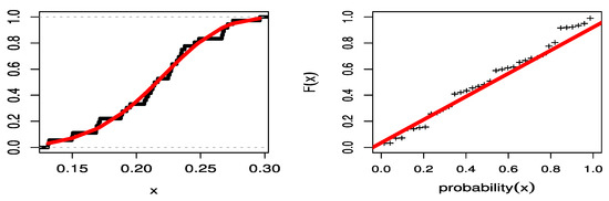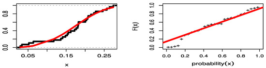As can be seen, the TLPTLE, TLGE, K, Beta, UW, UEHL, and MOK distributions work well for modelling the COVID-19 mortality rates indicated in the Saudi Arabia data set, but that the UPBXD is the best. This is based on a significance level of 0.05. Figure 8 illustrates the estimated CDF in the red line with empirical CDF in the black line. It also shows the probability–probability (PP) plots of the UPBXD in the red line, also known as “parametric plots”, for the COVID-19 mortality rates of the Saudi Arabia data set, which demonstrate the empirical findings, reported in Table 7 and the empirical CDF line the (black) with the estimated CDF line (red).