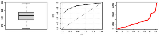 Figure 10 illustrates the PP plots for the COVID-19 mortality rates of the United Kingdom data set, which demonstrate the empirical findings reported in Table 8 and the empirical CDF line (black) with the estimated CDF line (red). Figure 11 shows three plots of COVID-19 mortality rates for the United Kingdom data set, where the left is a boxplot of data that explains that these data have no outlier values, the center is a TTT plot of data that explains that these data are increasing, and the right is a hazard estimated plot line that indicates the hazard is increasing.