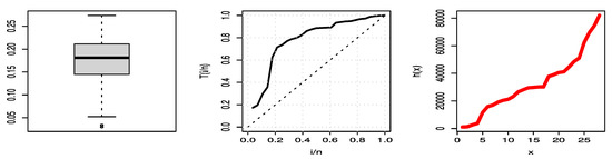 Figure 9 shows three plots of COVID-19 mortality rates for the Saudi Arabia data set, where the left is a boxplot of data that explains that the data have no outlier values, the center is a TTT plot of data that explains this data set is increasing, and the right is a hazard estimated plot line that indicates the HF is increasing.