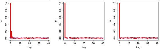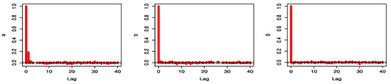 The autocorrelation function (ACF) is generated as shown in Figure 14 and Figure 15. Figure 16 and Figure 17 demonstrate the symmetric normal distribution of the posterior density for the parameters of the UPBXD.