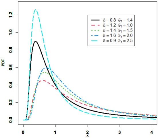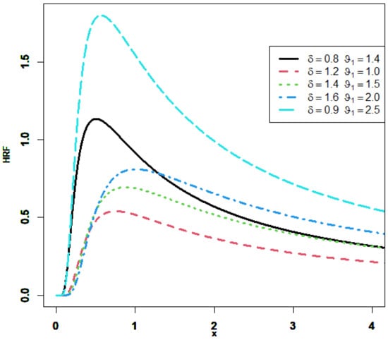 Ref. [24] mentioned that the GIED is a special case of the exponentiated Fréchet distribution. Due to the CDF closed shape, the GIED is frequently used in studies, including accelerated life testing, horse racing, grocery store lines, sea currents, wind speeds, and a variety of other topics (see [25]). Figure 1 displays the different forms achieved with the PDF. We can observe that it is right-skewed and unimodal. Depending on the distribution’s shape parameter, the HRF of the GIED increases then decreases, in an upside-down shape, but it is not constant, as illustrated in Figure 2.