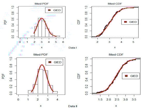 Estimated PDF and CDF plots using Data I and II for the GIED.