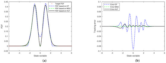 We analyze Figure 1b, Figure 2b, Figure 3b and Figure 4b and find that, when the target PDF has a Gaussian distribution, the tracking error of the EP method and MGC method is smaller than that of the HLF method. However, when the target has a beta distribution, the tracking error value of our method is significantly better than that of the EP method and the MGC method, and its error fluctuation is also much smaller. For the tracking error of a bimodal target PDF, the MGC method is the smallest, the HLF method is the second, and the EP method is the largest. If the target is a complex multimodal shape, the EP method has the largest fluctuation range in terms of the tracking error, and is therefore inferior to the MGC method and our method. Overall, when the target PDF is asymmetric or has a more complex trimodal shape, the resulting PDF from the HLF method tracks the target PDF significantly better than the other two methods.