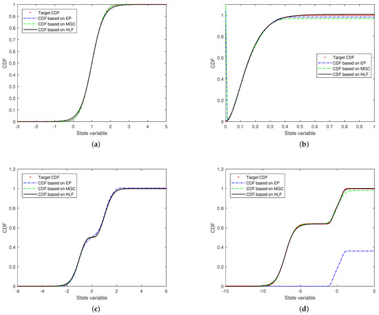 For the above four cases, in order to more clearly analyze and compare the PDF shape control performance of the three methods, we provide the cumulative distribution function (CDF) curves of the PDF from the three methods and the target PDF, as shown in Figure 5a–d.