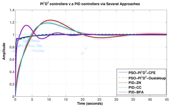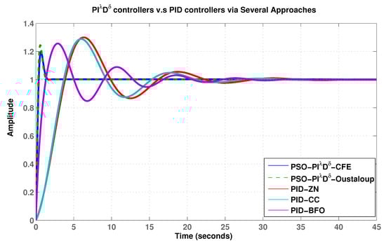 Table 2 presents a numerical comparison between the five methods in which the gain of PID and FOPID is shown based on a certain transfer function of linear motion. Table 3 draws attention to the dynamic results of the closed-loop transfer functions given in and , while Figure 2 reflects the advantage and accuracy of the CFE and Oustaloup methods as they show a clear decrease in the amount of overshoot followed by a tendency to quickly stabilize.