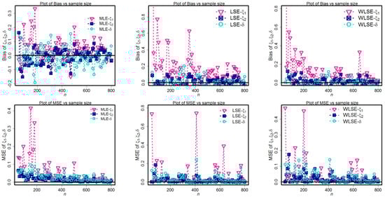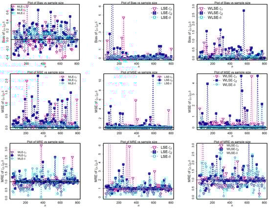 Using 1000 replications, keep repeating steps 1 to 4 again. Compute the MLEs, LSEs, and WLSEs for the 1000 samples; if for to acquire numerical outcomes for the simulation experiment, the statistical software R is employed. The following quantities are used to interpret the simulation results.