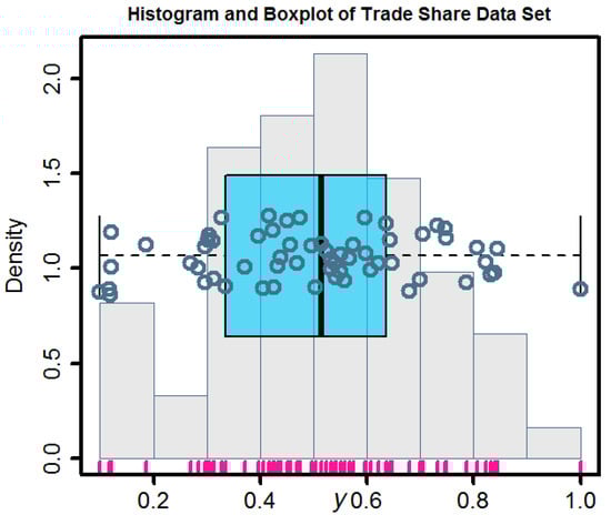 30], scholars investigate this data set as well. The data on trade share is right-skewed or almost symmetrical and the value of excess kurtosis shows distribution is thin-tailed or close to platykurtic with a moderate standard deviation, as seen in