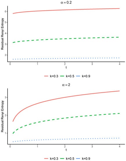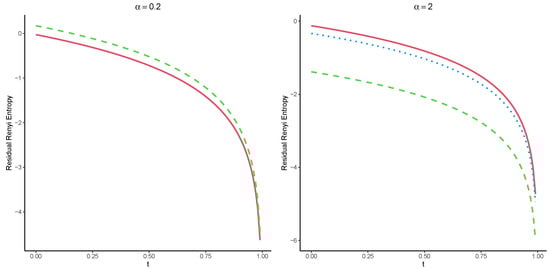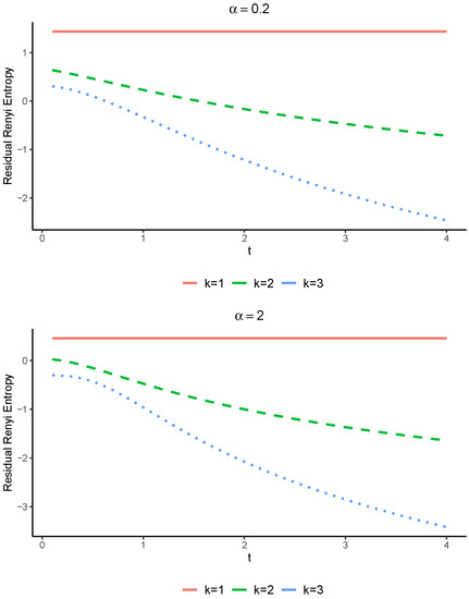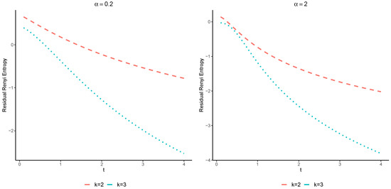 Let us assume two coherent systems with residual lifetimes and with the common signature Suppose that and , where stands for the Weibull distribution with the SF given in Equation (17). It is easy to see that Moreover, X and Y are both the IFR. Therefore, Theorem 5 yields that for all The plots of the Renyi entropies of these systems are displayed in Figure 3.