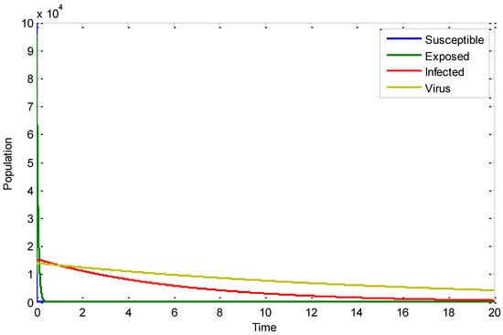 Figure 2 shows the extinction of the variation susceptible population. This means if no control of the shedding effect is observed, subsequently all people in the population will become infected.
