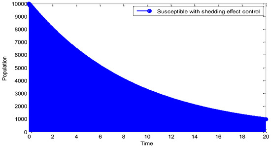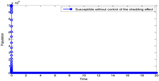 From Figure 3, it can be observed that application of shedding effect control increases the susceptible population. It is clear that there may be a decrease in the population which can be attributed to direct infection of the disease, but the control prevents the population from extinction.