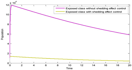 Figure 4 compares the exposed population with and without shedding effect control. It can clearly be seen that application of the control measure has a positive effect on the exposed class as it minimizes it. The proliferation of the disease can be attributed to the direct infection.