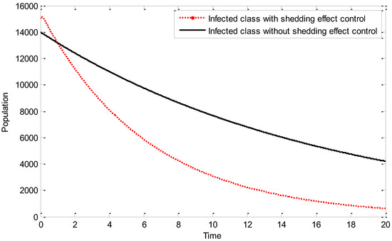 Figure 5 compares the infected population with and without shedding effect control. It can clearly be seen that application of the control measure has a positive effect on the infected class as it minimizes it. The proliferation of the disease can be attributed to the direct infection.
