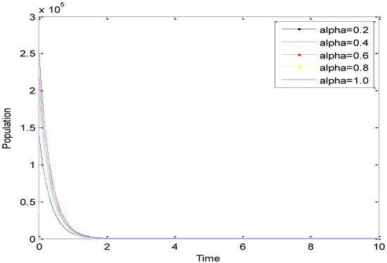 Figure 6 shows the influence of the variation in the fractional-order α on the biological behavior of the infected population. It is clear from this Figure that the population has a decreasing effect when α is increased from . Hence, the memory effect can be seen clearly.