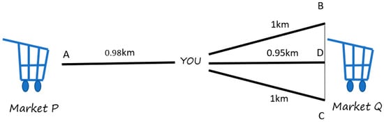 In order to answer the question: How to use CFSs in our real life? we use the following example to show the particularity of CFSs, which is introduced by Dai et al. [21]. In real life, we often ask passers-by for directions to the nearest market. If there are two markets and their distance and direction are given by two people and they both think market P is about 0.98 km from you and market Q is about 1 km from you, they have different views on the direction of market Q. One person thinks market P is located at A and market Q is located at B, another person thinks market P is located at A but market Q is located at C, as shown in Figure 1. Combining the opinions of these two people, we think market Q is located at the center of B and C. Then, the distance to market Q is about 0.95 km. Therefore, we decided to go to market Q. Interestingly, it is a preference reversal phenomenon. Both people think market P is nearer than market Q, but our result is that Q is nearer than market P. Distance and direction are two parameters used in this example. The center-based aggregation method is reasonable. The ranking which is only based on the distance is also reasonable. CFSs theory can perfectly describe the above phenomenon. In many other extensions of FSs, all parameters are used in the ranking. For example, both membership degree and non-membership degree are used in the ranking of IFSs.