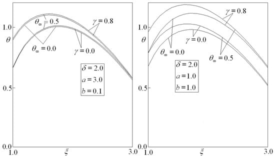 Figure 3 and Figure 4 present the dimensionless temperature distribution for two values of ( and ) and some selected values of , , and . The results were obtained for and (without the non-convexity effects).