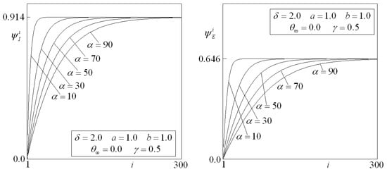Figure 5 presents and (elements of the sequence) as a function of for three considered values of , illustrating the process of convergence.