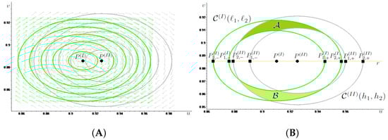 We recall that a geometrical configuration analogous to that depicted in Figure 1B, except for the need for orbits to lie in the unit square, was found in [28] (cf. Figure 2 therein), where the LTMs method was applied to a periodically forced asymmetric second order ODE. However, in that case, the abscissa of the center decreased passing from the unperturbed regime to the perturbed one and the centers of the systems corresponding to the two regimes were located on the horizontal axis. Although both dissimilarities would not require the introduction of relevant differences in the statement and proof of the main result in [28] (cf. Theorem 1.2 therein), in adapting them to our framework, we provide a slightly more general (In (Theorem 1.2 in [28]) the special case of Proposition 1 with and considered) version of (Theorem 1.2 in [28]) in Proposition 1, together with a complete proof (contained in the Appendix A) for the reader’s convenience.