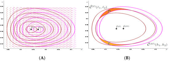 In view of stating our result about System (13) (cf. Proposition 2 below), for which we do not provide a proof, due to its similarity with the verification of Proposition 1, we introduce the Poincaré map associated with System (13), that can be decomposed as where is the Poincaré map associated with System for and is the Poincaré map associated with System for Notice that every pair of linked together annuli for System (13), being made of energy level lines of Systems are invariant under the action of We denote by for all the period of and by for all the period of recalling that the period of an orbit is the time needed by the solution to the considered system, starting from a certain point of the orbit, to complete one turn around the corresponding center, moving around the orbit itself. As discussed above, the increasing monotonicity of and with the energy levels is suggested by the many simulative experiments that we performed and by the accurate numerical analysis in (Section 5.3 in [8]), but, to the best of our knowledge, a rigorous proof is not available in the literature. In the absence of a result showing that the period of orbits of Systems and always increases with energy levels, in Proposition 2 we assume that, given two linked together annuli for System (13), the period of the orbits composing their inner boundary is smaller than the period of the orbits composing their outer boundary. The main difference between Propositions 1 and 2 lies, indeed, in the necessity to exclude in the latter the fact that the period remains unchanged between the inner and outer boundaries of the linked annuli, since a variation in the periods is required for the Poincaré map to produce a twist effect on the annuli, which in turn allows the LTMs method to be applied. We recall that for System (4) such a variation was granted by the results in [24,25] on the monotonicity of the period of orbits for the Lotka–Volterra predator–prey model.