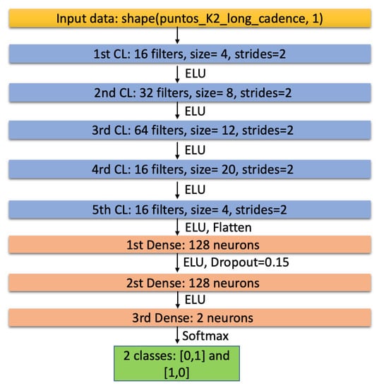 The choice of two neurons in the last Dense layer was motivated by the fact that in our datasets (Section 2.3), we have light curves with transits and without transits, i.e., two classes. Thus, we wanted the output of the CNN to be only (1,0) or (0,1), depending on whether transits were present or not. In other words, we aimed to create a CNN classifier that could help us to reduce the amount of time needed to know if a light curve presents transit-like signals or not. A diagram of our CNN model is shown in Figure 2.