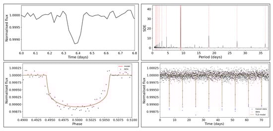 We conducted a real TLS [17] analysis of one of the simulated light curves to check if the simulated transits could be detected with traditional analysis. These planetary system parameters are shown in Table 1, and the simulated light curve is shown in Figure 4. We magnified the epoch of this light curve for testing the Mandel and Agol shape (top left panel in Figure 5) to verify its shape. As shown, the transit is affected by noise, so it does not follow a perfect Mandel and Agol shape (see Figure 3), which is common in real light curve data. After analyzing the light curve (Figure 4) with TLS, we obtained that it presented a transit-like signal, as shown in the top right panel in Figure 5, which corresponds to the signal detection efficiency (SDE) graphic, which plots the likelihood of each possible value of the orbital period being the real one. If one clear peak exists in this graphic (as in this case), the code has found a possible transit-like signal in the light curve. Additionally, we computed the phase-folded light curve (bottom left panel in Figure 5). As shown, the computed Mandel and Agol shape fits the data well (black dots). In addition, TLS allowed us to plot which of the points of the light curve were selected as part of the transits. This result is shown in the bottom right panel in Figure 5. Again, black dots correspond to the simulated light curve, blue dots are the light curve transit points, and the red line shows the computed model (without folding it upon the epoch). All these results show that our simulated light curves with transits could be detected with traditional models.