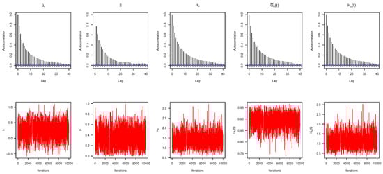 To evaluate the convergence of the simulated MCMC draws of , , , or , when , and Scheme-1 (as an example), both the autocorrelation and trace convergence diagnostic plots are shown in Figure 1. It shows that the samples drawn from the Markov chain of all the unknown parameters are mixed adequately, and thus the calculated estimates are satisfactory.
