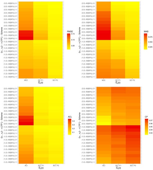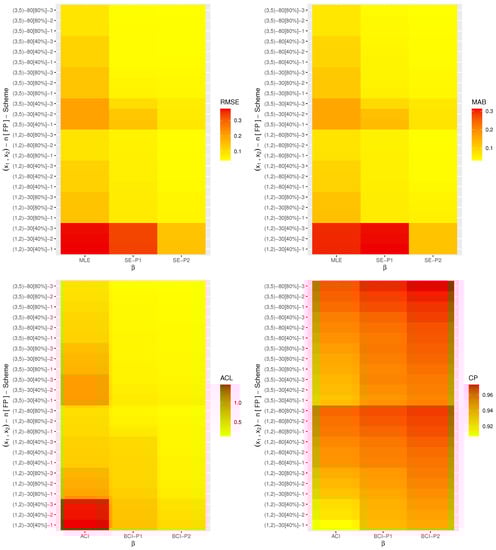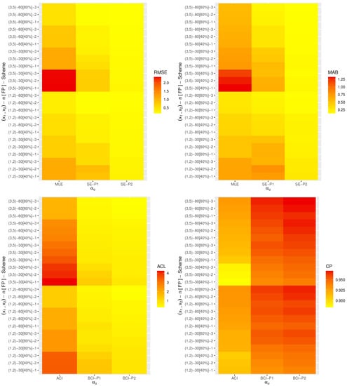 Nowadays, heat-map data visualization has become a popular tool for digital data representation as the value of each data point is indicated using specific colors. Therefore, all the simulated results (including the RMSE, MAB, ACL and CP) of , , , and are displayed by a heat-map tool in Figure 2, Figure 3, Figure 4, Figure 5 and Figure 6, respectively. Specifically, for Prior-1 (say P1) as an example, the Bayes estimates are mentioned as “BE-P1”, whereas the BCI estimates are mentioned as “BCI-P1”. All the numerical tables are also available as Supplementary Materials.