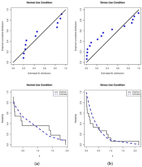 This application provides an analysis of the oil breakdown times (OBTs) of an insulating fluid subjected to various high test voltages. From Nelson [28], two data sets (in seconds) under different stress levels (kilovolt or kV) are considered; one is taken from 30 kV (normal use condition) and the other is taken from 32 kV (stress use condition). For computational convenience, each breakdown time point is divided by one hundred. So, the new transformed OBT data are presented in Table 1. Before addressing our inference, to check whether the XL model provides a significant fit to the OBT data or not, the Kolmogorov–Smirnov (KS) statistics along its p-value at a 5% significance level are considered. First, from Table 1, the MLE (standard error (SE)) of based on the normal and stress use OBT data sets is 1.5101(0.3835) and 2.6212(0.6097), respectively. Correspondingly, the KS (p-value) of the normal and stress use data sets is 0.203(0.682) and 0.309(0.089), respectively. It indicates, for both given stress levels, that the XL model fits the OBT data appropriately. Graphically, from Table 1, the fitted/empirical RFs as well as the probability–probability (PP) plots are plotted and shown in Figure 7. As we anticipated, Figure 7 shows that the proposed XL model provides a suitable fit to the OBT data sets.