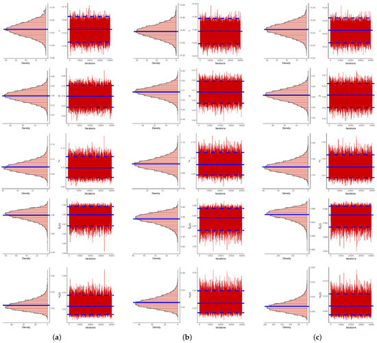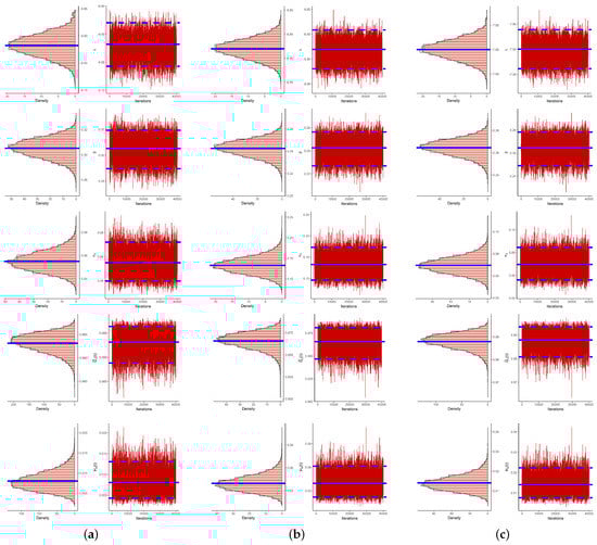 Density (left) and trace (right) plot of , , , and from OBT data. (a) Sample 1; (b) Sample 2; (c) Sample 3.