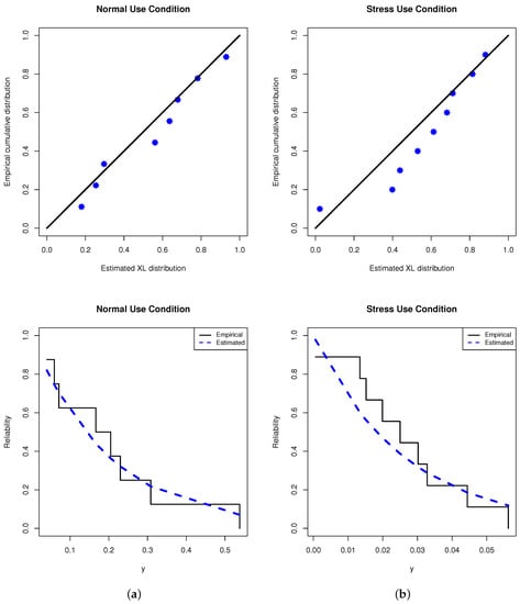 In this application, to show the usefulness of the proposed estimation approaches and to verify how our estimates work in practice, the failure times (in hours) of the TLT at high voltage are analyzed. These data were first given by Nelson [28] and later re-analyzed by Nassar et al. [9]. Under three accelerating stresses, 35.4, 42.2 and 46.7 kV, the TLT data sets were generated. In Table 4, each failure time in 35.4 kV (as normal use data) and 42.2 kV (as stress use data) is divided by 1000 for computational purposes, and the new transformed TLT data are presented. From Table 4, the MLE (SE) of based on the normal and stress use TLT data sets is 5.0778(1.7186) and 37.968(12.640), respectively. Next, the KS distance and its (p-value) from the normal and stress use TLT data sets is 0.185(0.901) and 0.287(0.374), respectively. This result is evidence that the XL model fits the TLT data sets well. On the other hand, in Figure 9, two plots, namely the fitted/empirical RFs and PP of the XL model, are displayed. It supports the same goodness-of-fit findings.