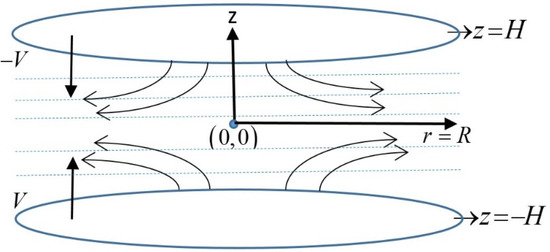 In this study, the quasi-steady axisymmetric flow of slightly viscoelastic fluid film with constant density and viscosity squeezed between two circular disks of radius is assumed, and its geometry is illustrated in Figure 1. The fluid film thickness between two disks is taken as , and both disks move towards each other with constant velocity . The cylindrical coordinates are used to study the dynamics of the fluid because the fluid contains velocities in both radial and axial directions. The origin of the coordinate system is considered at the center of the channel. There is symmetry in the z-axis.