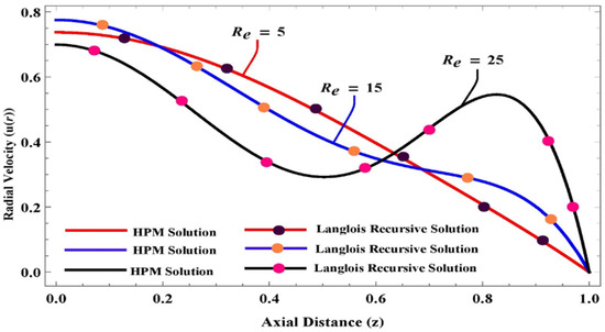 Figure 3, Figure 4, Figure 5, Figure 6, Figure 7, Figure 8, Figure 9, Figure 10, Figure 11 and Figure 12 were produced using the mathematically based program Mathematica, and portray the nondimensional flow variables for various values of pertinent parameters without the use of asterisks. The outcomes of the radial velocity by the Langlois recursive approach of viscous fluid at distinct Reynolds number values are compared with the homotopy perturbation method in Figure 3. It is clear that the outcomes of both methods agree with each other.