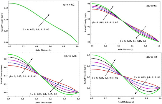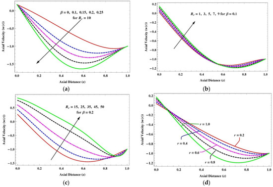 Figure 8a–d reveals the effects of the slightly viscoelastic parameter , Reynolds numbers and radial points , respectively, on the axial velocity. The value of the velocity is negative in the graph, which interprets the flow as moving in a downward direction. The magnitude of the axial velocity with the effect of inertia amplifies with surges in , but the boundary layer thickness drops. Moreover, the axial velocity of the slightly viscoelastic fluid with a fixed value of increases in the radial direction, and the magnitude of the axial velocity diminishes due to the increment in Reynolds number for large and small values. The backward flow in axial velocity is initiated from .