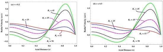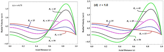 The impact of large Reynolds numbers (from 10 to 50) on radial velocity of the slightly viscoelastic and Newtonian fluid at distinct radial points is illustrated in Figure 4 and Figure 6. Therefore, it is noticed from the figures that the radial velocities of both fluids accelerate near the edges of the channel on the surging in Reynolds number, but it declines around the central region of the channel. Moreover, it is observed that boundary layer thickness decreases in Newtonian fluid as compared to slightly viscoelastic fluid, and the backward flow is initiated from the Reynolds numbers . In contrast, the reverse behavior (boundary layer thickness is increasing) appears for the effect of small Reynolds numbers (from 1 to 10) on the radial velocity, as shown in Figure 6a–d, while a similar pattern of the velocity profile on the rise of the Reynolds number is validated by the work of Anum Shafiq [24].